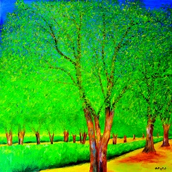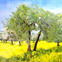 Olivenhain im Unwetter 100 x 100 cm, XL Keilrahmen Öl auf Leinwand Mit diesem Bild setze ich meine Serie von Olivenbäumen fort. Während noch die letzten Sonnenstrahlen auf die Bäume fallen, zieht im Hintergrund eine dunkelblaue Unwetterfront auf. Windböen spielen bereits mit den Blättern. |