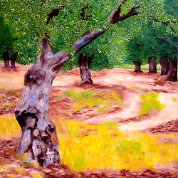 Olivenhain auf roter Erde 100 x 100 cm, XL Keilrahmen Öl auf Leinwand Dieses Bild zeigt einen Olivenhain auf roter Erde in Istrien. Ein Olivenbaum kann sehr alt werden, meist mehrere hundert Jahre. Das Alter der ältesten bekannten Exemplare schätzt man sogar auf mehrere tausend Jahre. Mit dem Alter wird ein Olivenbaum immer schöner, da seine Stämme immer rissiger und knorriger werden. Istrien gehört zu den nördlichsten Gebieten Europas in denen Olivenöl gewonnen wird. Hier unterteilt man die Anbaugebiete nach der sogenannten Roten Erde und nach der Braunen karbonhaltigen Erde. |