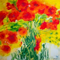 Mohnblumen im Kornfeld 50 x 70 cm, Keilrahmen Öl auf Leinwand Das Bild zeigt mehrere Mohnblüten in einem Kornfeld. Das Kornfeld und das Grün der Blüten ist nur angedeutet. Hier wirken die Blüten wie ein Ballett. |