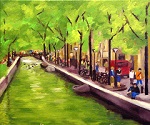 Amsterdamer Gracht 50 x 60 cm Keilrahmen Öl auf Leinwand Das Bild zeigt eine typische Amsterdamer Gracht. Man sieht eine mit Bäumen bestandene Gracht entlang. Dort liegen Boote. Rechts erkennt man eine Straße auf der reges Treiben herrscht. In der Ferne ist eine Brücke über die Gracht zu erkennen. |