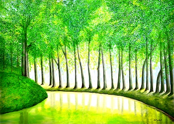 Märkische Flusslandschaft 40 x 50 cm Öl auf Leinwand, Keilrahmen Das Bild zeigt eine Flusslandschaft nahe bei Iserlohn. Zwischen Ruhrniederung, Ebbegebirge und Listertal treffen einzigartig Tier- und Pflanzenarten des Tief- und Berglandes zusammen. Schlucht-, Moor- und Kalkbuchenwälder sind hier ebenso zu Hause wie Wacholder-Bergheiden. Geradezu landschaftstypisch für den Märkischen Kreis sind die reizvollen, bachdurchflossenen Mittelgebirgswiesentäler. |