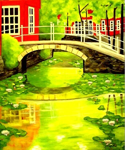 Seerosen in einer Gracht 120 x 100 cm XL Keilrahmen Öl auf Leinwand Das Bild zeigt Seerosen in einer Gracht mit einer Steinbrücke, dahinter reihen sich rote Backsteinhäuser aneinander. Grachten üben seit jeher eine besondere Faszination aus, wie schon meine Begeisterung für Delft zeigt. Das Leben am Wasser – etwa auf einem Hausboot – vermittelt ein Gefühl von Freiheit, das jedoch auch seinen Preis hat. Der Begriff „Gracht“ geht auf „Gräfte“ zurück, den mittelalterlichen Wassergraben, der in manchen Städten bis heute erhalten ist. |