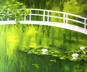 Weiße Brücke am Seerosenteich 100 x 120 cm XL Keilrahmen Öl auf Leinwand Seerosen waren schon immer ein beliebtes Motiv in der Malerei. Claude Monet legte 1893 in seinem Garten einen Wassergarten mit Teich, Seerosen, Schwertlilien und einer kleinen Brücke an. Diese Motive malte er bis zu seinem Tod 1926 immer wieder zu verschiedenen Tageszeiten und Lichtstimmungen. Mit zunehmendem Alter wurden die Formen seiner Seerosenbilder immer freier und näherten sich teilweise der Abstraktion. |