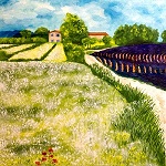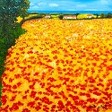 Dorf hinterm Kornfeld 50 x 50 cm Öl auf Leinwand, Keilrahmen Das Bild zeigt ein Kornfeld und die Umrisse eines Dorfes im Hintergrund. Nahezu versteckt liegt dieses Dorf hinter dem Kornfeld. Der Mohn überwuchert das Korn und drängt es in den Hintergrund. Links sieht man die Bäume eine Waldes ins Bild ragen. Schon van Gogh fand Gefallen an einem Kornfeld im südlichen Flair und malte das Kornfeld mit Zypressen. |