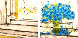 natürlich im Übermaß,wie unser allgemeiner Umgang mit der Natur. Der Blick durch das Fenster zeigt eine schneebedeckte Gartenlandschaft im hellen Sonnenschein und setzt sich aus titan-weißen, kobalt-blauen und neapel-gelben Flächen zusammen. Die schneebedeckten Äste der Bäume sind nur schwach zu erkennen. Ein schmaler Streifen zeigt die Hauswand mit ockerfarbenen Ziegeln. Fenster und Fensterbank sind mit Vandyckbraun in groben Strichen angedeutet und unterstreichen so den verwitterten Zustand ihrer weißen Farbe. Die Szene auf dem Fensterbrett liegt im Schatten und lässt das Weiß des Fensters eher grau erscheinen, im Gegensatz zum kräftigen Orange des Rotkehlchens und dem Grün-Blau der Kornblumen. Die perspektivische Darstellung des Fensters unterstreicht die räumliche Tiefe des Bildes. Das Bild steht für die Zerbrechlichkeit von Flora und Fauna. Noch können wir Menschen einen Teil unserer Zeit ohne Fenster verbringen. Wer aber garantiert uns, dass nicht eines Tages viele Lebensformen nur noch hinter Fenstern leben können, so wie es Raumfahrer derzeit auf einer Raumstation tun und wie lange lässt sich dies aushalten? |