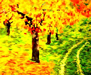 Herbstliche Streuobstwiese 100 x 120 cm, Keilrahmen Öl auf Leinwand Dieses Bild zeigt eine herbstliche Streuobstwiese. Die Bäume stehen weit auseinander und tragen noch vereinzelt reife Äpfel und Birnen, deren Farben von sattem Rot bis zu warmem Gelb reichen. Am Boden liegt hohes, leicht verwelktes Gras, durchsetzt mit herabgefallenen Blättern und Früchten. Das Licht ist weich und golden, typisch für einen sonnigen Herbsttag, und verleiht der Szene eine ruhige, beinahe nostalgische Stimmung. Rechts sind die Spuren eines Feldweges erkennbar. |
