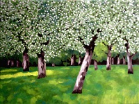 Obstwiese im Frühling 60 x 80 cm, XL Keilrahmen Öl auf Leinwand Das Bild zeigt eine Obstwiese im Frühling. Im Gegensatz zur Streuobstwiese (oberes Bild) lebt dieses Bild von den Gegensätzen dunkler und heller Farben. Ein Wald im Hintergrund bringt Schatten. Unserer heutigen Obstsorten gab es als Wildformen schon vor tausenden von Jahren. Kultiviertes Obst kam erst durch die Römer nach Deutschland. Waren es zuerst nur Klöster und Gutshöfe, so dehnte sich der Anbau später auch in den Ortschaften aus. Bis zur ersten Hälfte des 20. Jahrhunderts waren mehrere tausend Obstsorten bekannt. Der Rückgang kam dann mit dem aufkommenden Plantagenanbau. |