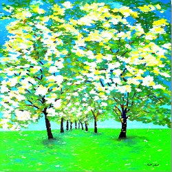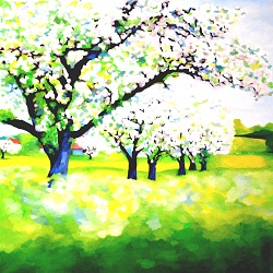 Streuobstwiese 100 x 100 cm, Keilrahmen Öl auf Leinwand Dieses Bild zeigt eine Streuobstwiese im Frühling mit ihren blühenden Bäumen und dem frischen Grün der Gräser und Kräuter. Immer wieder ist es überwältigend zu sehen, mit welcher Schönheit die Natur das Ende des Winters ankündigt. In solchen Momenten juckt es mich in den Fingern, wenigstens einen Teil dieser Pracht in meinen Bildern festzuhalten. Es lässt sich kaum verleugnen, dass ein Großteil meiner Motive aus Frühlingslandschaften stammt. |