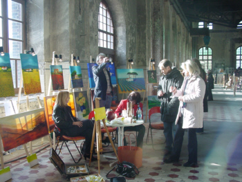 von Ernst Heye, in der mehrere Kugeln bewegt werden. Oder die anmutige Ballerina vor einem Hintergrund aus tiefem Blau, die Harald Nahrstedt auf eine Leinwand gezaubert hatte. Ebenbürtige Konkurrenz bot die etwas vollschlanke Ballerina von Barbara Hänsel, die sich mit ihren Dick-Madames aus Holz bereits einen Namen machte. Einen Kontrast zum kühlen Ambiente der Maschinenhalle boten die Acrylbilder Gisela Trapps, bei deren Betrachtung man sich irgendwo am Mittelmeer wiederfand. Die Werke der Künstlerin greifen die Stimmung von französischen und italienischen Cafes auf, und der Duft der Croissants des Bistros nebenan stieg dem Betrachter bereits in die Nase und er machte sich bereit, gleich durch enge Gassen zu bummeln. |