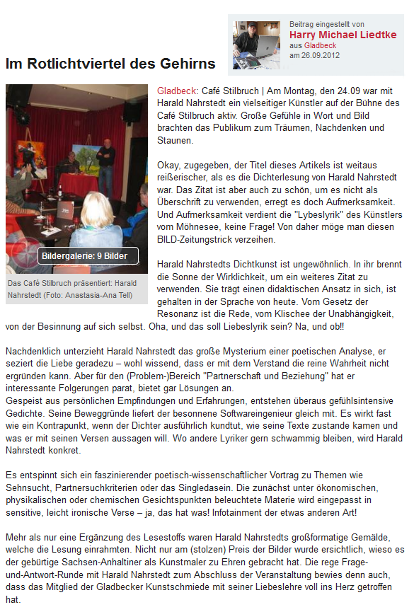 Psychologie & Lyrik Rezitation im Cafe Stilbruch zum Thema Liebeslyrik in Gladbeck, Rentforter Str. 58 24. Sept. 2012 um 20 Uhr |