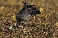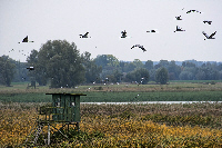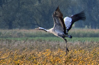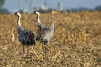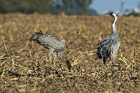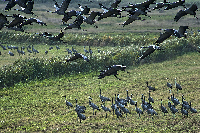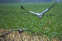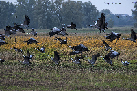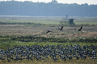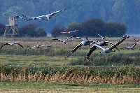 Bevor sie ihre Winterquartiere in Frankreich, Spanien und Nordafrika aufsuchen nehmen sie hier noch Nahrung auf. Die finden sie auf abgeernteten Mais- und Getreidefeldern. Täglich wechseln sie zwischen diesen Futterplätzen und ihre sicheren Schlafplätzen im Flachwasser. Die Rügen-Darß-Region ist eine der bedeutendsten Kranichnistplätze in Europa. Hier werden jährlich 30.000 bis 50.000 Exemplare gezählt. |