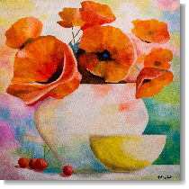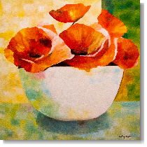 Mohnblumen in weißer Schale 80 x 80 cm, XL Keilrahmen Öl auf Leinwand Klatschmohnblüten in einer weißen Schale bilden einen sehr schönen Farbkontrast. |