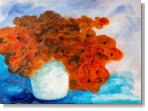 Mohnblumen in weißer Vase 30 x 40 cm, Keilrahmen Öl auf Leinwand Das Bild zeigt einen Mohnblumenstrauß in einer weißen Vase. Die Vase steht auf einer lackierten Fensterbank, in der sich das Blau des Himmels spiegelt. Dadurch verstärkt sich der Kontrast zwischen Blüten und Vase. |