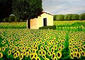 50 x 70 cm Öl auf Leinwand, Keilrahmen Das Bild zeigt ein Nutzgebäude inmitten von Sonnenblumenfeldern. Ich finde es immer wieder beeindruckend, wenn die Blütenköpfe mit der Sonne wandern. |