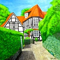 Bachsteingasse 50 x 50 cm, Keilrahmen Öl auf Leinwand Der alte Stadtkern von Soest ist geprägt durch den vielfach verwendeten grünen Sandstein, der in den Steinbrüchen um Soest abgebaut wurde. Hübsche Fachwerkzeilen und romantische Gässchen laden zu einem Spaziergang ein. Besonders im Frühjahr, wenn das erste Grün zu sehen ist, ist ein Spaziergang über die Wälle, die alte Stadtmauer, besonders reizvoll. |