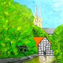 Großer Teich 50 x 50 cm, Keilrahmen Öl auf Leinwand Der große Teich entstammt zahlreichen Quellen, so dass er auch im Winter nicht zufriert. Früher diente das Wasser wahrscheinlich zur Regulation der anliegenden Wassermühle, die im Vordergrund zu sehen ist. Im Hintergrund sind die Türme der Wiesenkirche zu sehen, eine der zahlreichen Kirchen in Soest. Die Wiesenkirche besitzt ein Fensterbild, das als Westfälisches Abendmahl bekannt ist. Darin sind statt Wein und Brot, Bier und Schinken dargestellt. Am Teich ist noch heute eine gelbe Wippe zu sehen, ein Strafgerüst aus dem Mittelalter. Darauf wurden Diebe zur Freude der Zuschauer als Strafe in den Teich gewippt. |