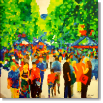 Las Ramblas 100 x 100 cm, Keilrahmen Öl auf Leinwand Das Bild zeigt eine Menschenmenge auf der Rambla, wie sie an schönen Tagen immer zu finden ist. Die Las Ramblas gelten als die Flaniermeile und als der berühmteste Boulevard von Barcelona mit einer Länge von 1.259 Metern. Sie führen vom Placa de Catalunya bis hinunter zum Hafen Port Vell und somit durch die komplette Altstadt. Sie trennen das Altstadtviertel Barri Gotic und das Viertel El Raval voneinander und sind auf beiden Seiten von Autofahrbahnen gesäumt. |